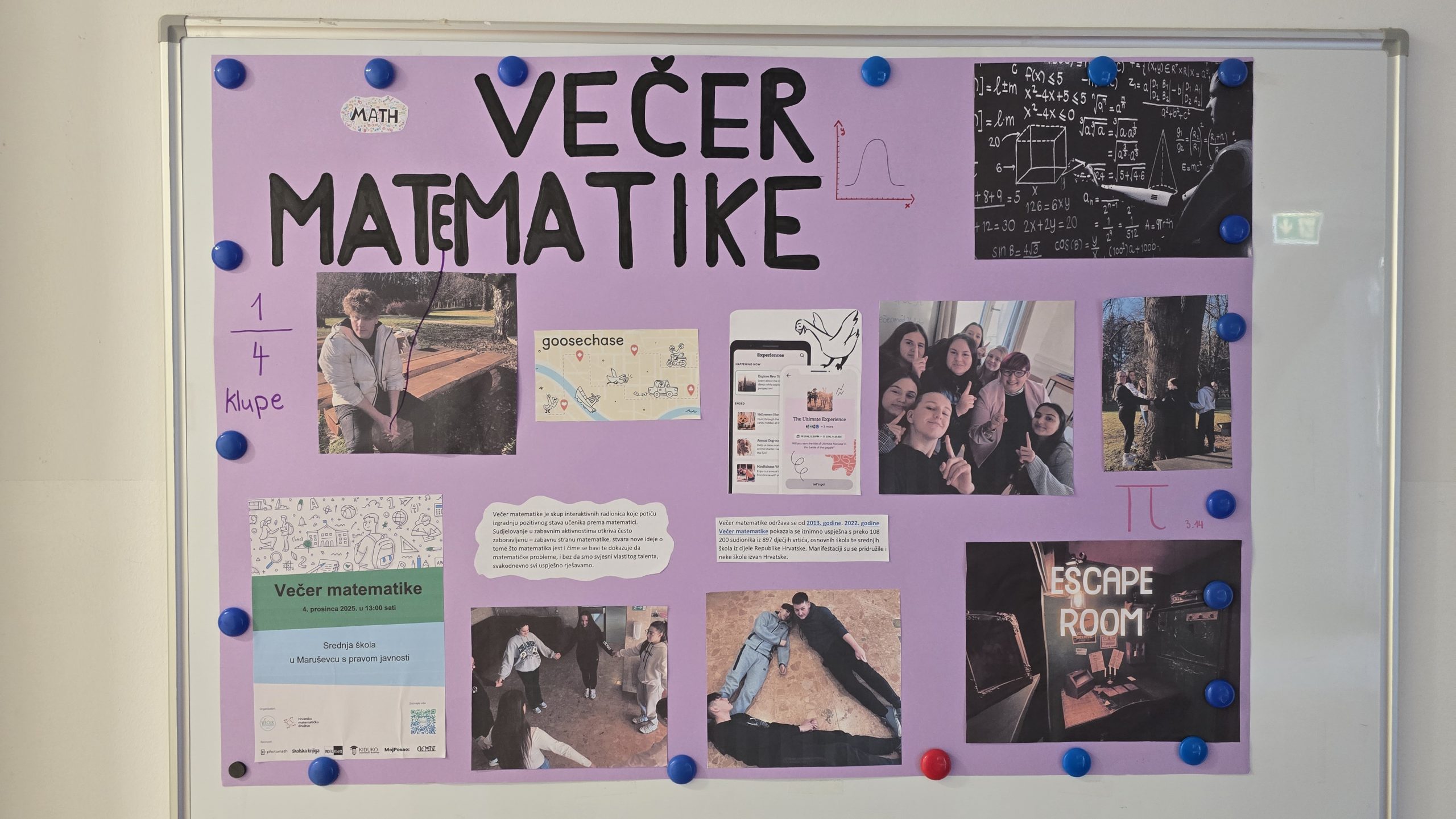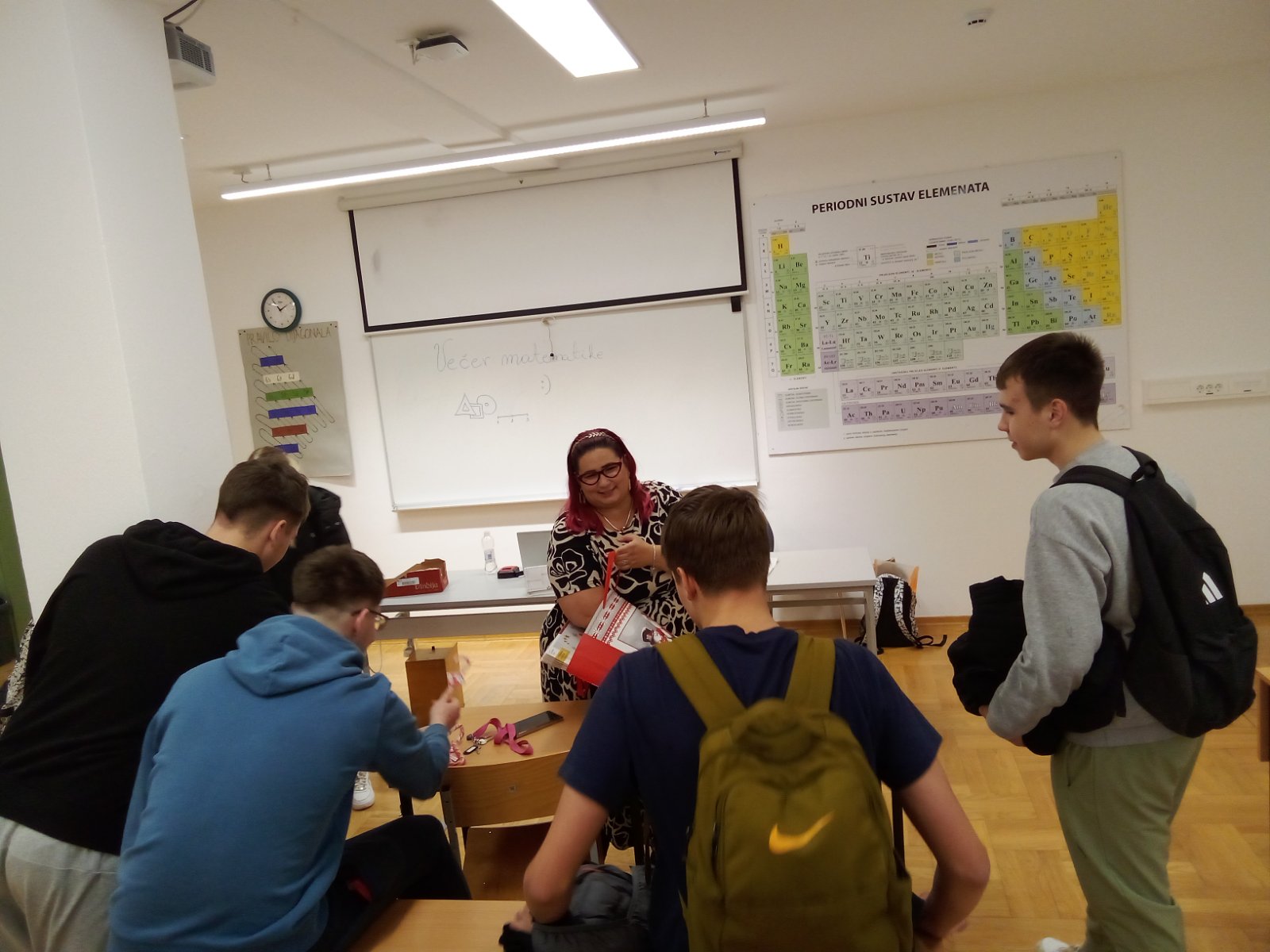 U našoj je školi 4. prosinca održana Večer matematike, događaj koji tradicionalno organiziramo već dugi niz godina. Večer matematike je projekt Hrvatskog matematičkog društva koji se provodi u isto vrijeme u vrtićima, osnovnim i srednjim školama diljem Hrvatske. Ove je godine sudjelovao 51 učenik, što je najviše do sada. Razredi 1.m, 1.f, 2.m, 2.f, 3.f, 3.m i 4.f sudjelovali su u radionicama Goosechase i Escape room. Profesorica matematike Sanja Orešković Spiegel rasporedila ih je u skupine kako bi rješavali zadatke u timu.